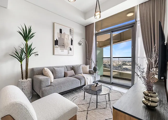 Elegant 1Br Flat In Business Bay With Pool & Gym Apartment includes a balcony, a living room, and a kitchen with an air conditioner for utmost comfort. This accommodation is equipped with a bathroom that features a hair dryer. You'll also come across a bidet, a separate toilet, and a shower.